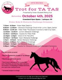 Front Range Back Country sponsored the PERC Trot for Ta Tas Poker Ride and Obstacle Course on October 4, 2025! Fun day for a great cause that raised $12,000 for the cancer recipient. FRBCH contributed $200.00. Our President, Shawna Jarvis, and member Chris Exley were winners participating in the Poker Ride and Obstacle Course at Greenland Open Space.